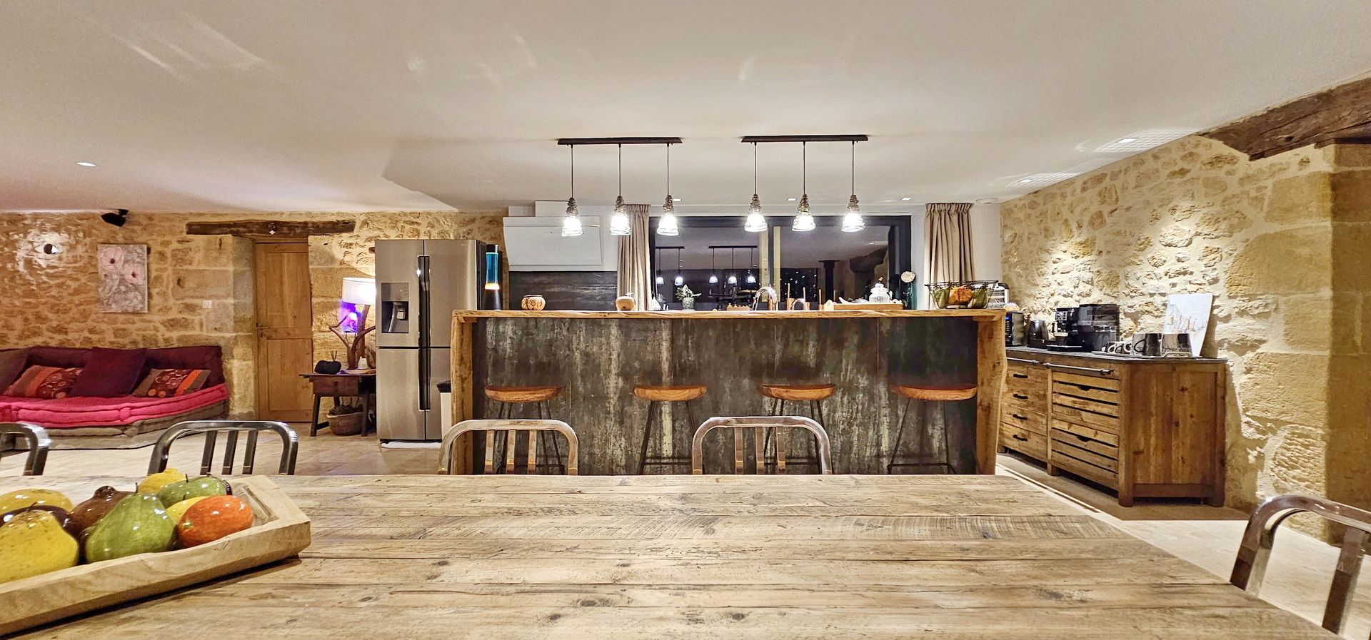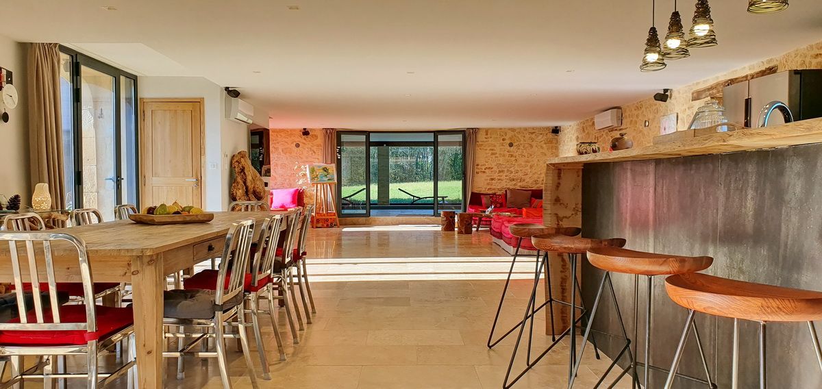 Espace salle à manger: climatisation, table repas 10 chaises, un buffet vaisselier, un poêle à bois.