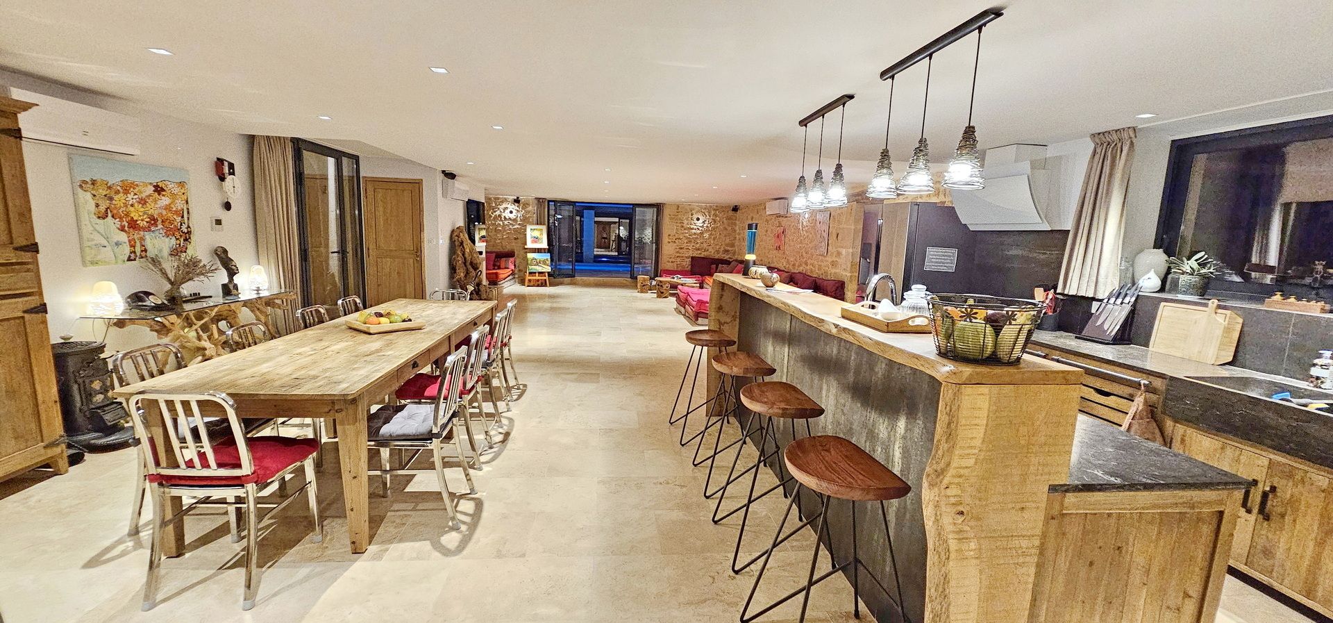 La cuisine ouverte entièrement équipée et le grand salon donnent sur la piscine intérieur.