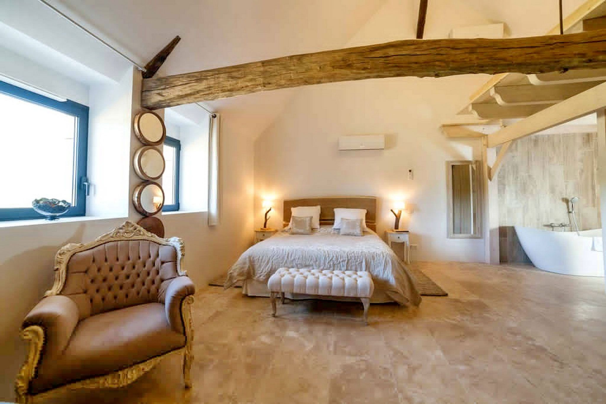 Он ориентирован на запад и с видом на поля и лес вокруг. P> У него есть кровать размера “king-size”, телевизор с плоским экраном, гардероб, стул и письменный стол, два кресла и базовый стол, бесплатный Wi-Fi и тапочки. P> Ванная комната в ванной комнате есть островная ванна и душевой душ, двойной бассейн, фен и полотенцереза. P>